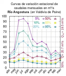 El caudal del río (en un lugar fijo) varía en el tiempo, por lo que existen varias formas de representarlo. Una de ellas son las curvas de variación estacional que, tras largos periodos de mediciones, predicen estadísticamente el caudal mínimo que lleva el río con una probabilidad dada, llamada probabilidad de excedencia. La curva de color rojo ocre (con ) muestra los caudales mensuales con probabilidad de excedencia de un 50%. Esto quiere decir que ese mes se han medido igual cantidad de caudales mayores que caudales menores a esa cantidad. Eso es la mediana (estadística), que se denota Qe, de la serie de caudales de ese mes. La media (estadística) es el promedio matemático de los caudales de ese mes y se denota .