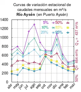 El caudal del río (en un lugar fijo) varía en el tiempo, por lo que existen varias formas de representarlo. Una de ellas son las curvas de variación estacional que, tras largos periodos de mediciones, predicen estadísticamente el caudal mínimo que lleva el río con una probabilidad dada, llamada probabilidad de excedencia. La curva de color rojo ocre (con ) muestra los caudales mensuales con probabilidad de excedencia de un 50%. Esto quiere decir que ese mes se han medido igual cantidad de caudales mayores que caudales menores a esa cantidad. Eso es la mediana (estadística), que se denota Qe, de la serie de caudales de ese mes. La media (estadística) es el promedio matemático de los caudales de ese mes y se denota .