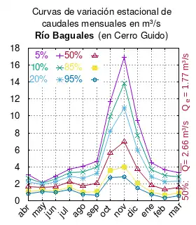 El caudal del río (en un lugar fijo) varía en el tiempo, por lo que existen varias formas de representarlo. Una de ellas son las curvas de variación estacional que, tras largos periodos de mediciones, predicen estadísticamente el caudal mínimo que lleva el río con una probabilidad dada, llamada probabilidad de excedencia. La curva de color rojo ocre (con ) muestra los caudales mensuales con probabilidad de excedencia de un 50%. Esto quiere decir que ese mes se han medido igual cantidad de caudales mayores que caudales menores a esa cantidad. Eso es la mediana (estadística), que se denota Qe, de la serie de caudales de ese mes. La media (estadística) es el promedio matemático de los caudales de ese mes y se denota .