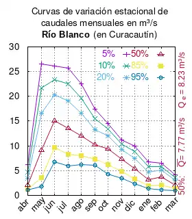 El caudal del río (en un lugar fijo) varía en el tiempo, por lo que existen varias formas de representarlo. Una de ellas son las curvas de variación estacional que, tras largos periodos de mediciones, predicen estadísticamente el caudal mínimo que lleva el río con una probabilidad dada, llamada probabilidad de excedencia. La curva de color rojo ocre (con ) muestra los caudales mensuales con probabilidad de excedencia de un 50%. Esto quiere decir que ese mes se han medido igual cantidad de caudales mayores que caudales menores a esa cantidad. Eso es la mediana (estadística), que se denota Qe, de la serie de caudales de ese mes. La media (estadística) es el promedio matemático de los caudales de ese mes y se denota .