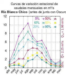 El caudal del río (en un lugar fijo) varía en el tiempo, por lo que existen varias formas de representarlo. Una de ellas son las curvas de variación estacional que, tras largos periodos de mediciones, predicen estadísticamente el caudal mínimo que lleva el río con una probabilidad dada, llamada probabilidad de excedencia. La curva de color rojo ocre (con ) muestra los caudales mensuales con probabilidad de excedencia de un 50%. Esto quiere decir que ese mes se han medido igual cantidad de caudales mayores que caudales menores a esa cantidad. Eso es la mediana (estadística), que se denota Qe, de la serie de caudales de ese mes. La media (estadística) es el promedio matemático de los caudales de ese mes y se denota .