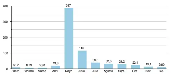 Considerando únicamente el periodo estival, libre de hielo (de mayo a septiembre inclusive), el caudal mensual mínimo observado fue de 12,8 m³/s en septiembre de 1969.
