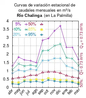 El caudal del río (en un lugar fijo) varía en el tiempo, por lo que existen varias formas de representarlo. Una de ellas son las curvas de variación estacional que, tras largos periodos de mediciones, predicen estadísticamente el caudal mínimo que lleva el río con una probabilidad dada, llamada probabilidad de excedencia. La curva de color rojo ocre (con ) muestra los caudales mensuales con probabilidad de excedencia de un 50%. Esto quiere decir que ese mes se han medido igual cantidad de caudales mayores que caudales menores a esa cantidad. Eso es la mediana (estadística), que se denota Qe, de la serie de caudales de ese mes. La media (estadística) es el promedio matemático de los caudales de ese mes y se denota .