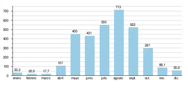 El caudal medio mensual observado en marzo (el mínimo estiaje) es de 17,7 m³/s, o sólo el 2,5% del caudal medio en agosto (713 m³/s), lo que demuestra la gran amplitud de las variaciones estacionales. En el período de observación de 59 años, el caudal mínimo mensual fue 2,45 m³/s, en marzo de 1936, mientras que el caudal máximo mensual fue de 1.710 m³/s o en junio de ese mismo año.