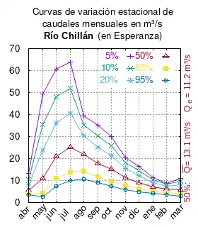 El caudal del río (en un lugar fijo) varía en el tiempo, por lo que existen varias formas de representarlo. Una de ellas son las curvas de variación estacional que, tras largos periodos de mediciones, predicen estadísticamente el caudal mínimo que lleva el río con una probabilidad dada, llamada probabilidad de excedencia. La curva de color rojo ocre (con ) muestra los caudales mensuales con probabilidad de excedencia de un 50%. Esto quiere decir que ese mes se han medido igual cantidad de caudales mayores que caudales menores a esa cantidad. Eso es la mediana (estadística), que se denota Qe, de la serie de caudales de ese mes. La media (estadística) es el promedio matemático de los caudales de ese mes y se denota .