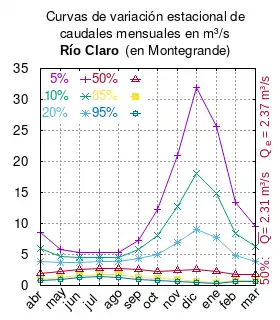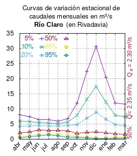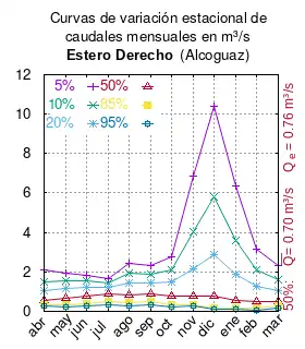 El caudal del río (en un lugar fijo) varía en el tiempo, por lo que existen varias formas de representarlo. Una de ellas son las curvas de variación estacional que, tras largos periodos de mediciones, predicen estadísticamente el caudal mínimo que lleva el río con una probabilidad dada, llamada probabilidad de excedencia. La curva de color rojo ocre (con ) muestra los caudales mensuales con probabilidad de excedencia de un 50%. Esto quiere decir que ese mes se han medido igual cantidad de caudales mayores que caudales menores a esa cantidad. Eso es la mediana (estadística), que se denota Qe, de la serie de caudales de ese mes. La media (estadística) es el promedio matemático de los caudales de ese mes y se denota .