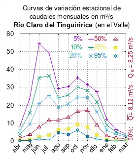 El caudal del río (en un lugar fijo) varía en el tiempo, por lo que existen varias formas de representarlo. Una de ellas son las curvas de variación estacional que, tras largos periodos de mediciones, predicen estadísticamente el caudal mínimo que lleva el río con una probabilidad dada, llamada probabilidad de excedencia. La curva de color rojo ocre (con ) muestra los caudales mensuales con probabilidad de excedencia de un 50%. Esto quiere decir que ese mes se han medido igual cantidad de caudales mayores que caudales menores a esa cantidad. Eso es la mediana (estadística), que se denota Qe, de la serie de caudales de ese mes. La media (estadística) es el promedio matemático de los caudales de ese mes y se denota .