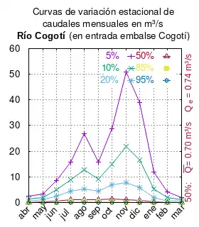 El caudal del río (en un lugar fijo) varía en el tiempo, por lo que existen varias formas de representarlo. Una de ellas son las curvas de variación estacional que, tras largos periodos de mediciones, predicen estadísticamente el caudal mínimo que lleva el río con una probabilidad dada, llamada probabilidad de excedencia. La curva de color rojo ocre (con ) muestra los caudales mensuales con probabilidad de excedencia de un 50%. Esto quiere decir que ese mes se han medido igual cantidad de caudales mayores que caudales menores a esa cantidad. Eso es la mediana (estadística), que se denota Qe, de la serie de caudales de ese mes. La media (estadística) es el promedio matemático de los caudales de ese mes y se denota .