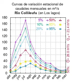 El caudal del río (en un lugar fijo) varía en el tiempo, por lo que existen varias formas de representarlo. Una de ellas son las curvas de variación estacional que, tras largos periodos de mediciones, predicen estadísticamente el caudal mínimo que lleva el río con una probabilidad dada, llamada probabilidad de excedencia. La curva de color rojo ocre (con ) muestra los caudales mensuales con probabilidad de excedencia de un 50%. Esto quiere decir que ese mes se han medido igual cantidad de caudales mayores que caudales menores a esa cantidad. Eso es la mediana (estadística), que se denota Qe, de la serie de caudales de ese mes. La media (estadística) es el promedio matemático de los caudales de ese mes y se denota .