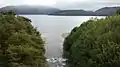 Vista del Lago Correntoso (delante) y el Lago Nahuel Huapi (atrás) desde el Cerro Bayo. En el centro de la imagen se ve el nacimiento del Río Correntoso (y el puente que lo cruza), pudiéndose apreciar su corta longitud.