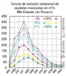 El caudal del río (en un lugar fijo) varía en el tiempo, por lo que existen varias formas de representarlo. Una de ellas son las curvas de variación estacional que, tras largos periodos de mediciones, predicen estadísticamente el caudal mínimo que lleva el río con una probabilidad dada, llamada probabilidad de excedencia. La curva de color rojo ocre (con ) muestra los caudales mensuales con probabilidad de excedencia de un 50%. Esto quiere decir que ese mes se han medido igual cantidad de caudales mayores que caudales menores a esa cantidad. Eso es la mediana (estadística), que se denota Qe, de la serie de caudales de ese mes. La media (estadística) es el promedio matemático de los caudales de ese mes y se denota .