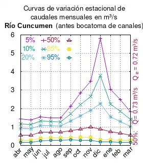 El caudal del río (en un lugar fijo) varía en el tiempo, por lo que existen varias formas de representarlo. Una de ellas son las curvas de variación estacional que, tras largos periodos de mediciones, predicen estadísticamente el caudal mínimo que lleva el río con una probabilidad dada, llamada probabilidad de excedencia. La curva de color rojo ocre (con ) muestra los caudales mensuales con probabilidad de excedencia de un 50%. Esto quiere decir que ese mes se han medido igual cantidad de caudales mayores que caudales menores a esa cantidad. Eso es la mediana (estadística), que se denota Qe, de la serie de caudales de ese mes. La media (estadística) es el promedio matemático de los caudales de ese mes y se denota .