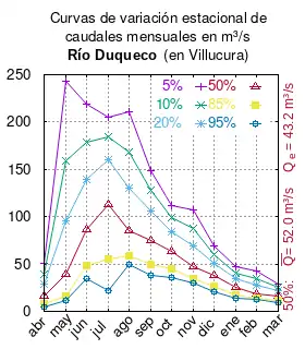 El caudal del río (en un lugar fijo) varía en el tiempo, por lo que existen varias formas de representarlo. Una de ellas son las curvas de variación estacional que, tras largos periodos de mediciones, predicen estadísticamente el caudal mínimo que lleva el río con una probabilidad dada, llamada probabilidad de excedencia. La curva de color rojo ocre (con ) muestra los caudales mensuales con probabilidad de excedencia de un 50%. Esto quiere decir que ese mes se han medido igual cantidad de caudales mayores que caudales menores a esa cantidad. Eso es la mediana (estadística), que se denota Qe, de la serie de caudales de ese mes. La media (estadística) es el promedio matemático de los caudales de ese mes y se denota .