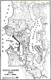 El río da a la bahía de Elliott en Seattle, dividiéndose por la isla artificial Harbor Island es dos canales, uno oriental y otro occidental.