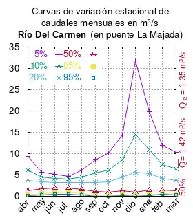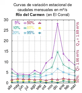 El caudal del río (en un lugar fijo) varía en el tiempo, por lo que existen varias formas de representarlo. Una de ellas son las curvas de variación estacional que, tras largos periodos de mediciones, predicen estadísticamente el caudal mínimo que lleva el río con una probabilidad dada, llamada probabilidad de excedencia. La curva de color rojo ocre (con ) muestra los caudales mensuales con probabilidad de excedencia de un 50%. Esto quiere decir que ese mes se han medido igual cantidad de caudales mayores que caudales menores a esa cantidad. Eso es la mediana (estadística), que se denota Qe, de la serie de caudales de ese mes. La media (estadística) es el promedio matemático de los caudales de ese mes y se denota .