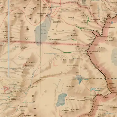 - Río Frió.-—Corriente de agua que contiene una mediana quebrada de la serranía de la falda occidental de los Andes del departamento de Taltal y que corre por pocos kilómetros de SE. á NO., cuyo punto, por donde la atraviesa el antiguo camino del Perú á Copiapó, se halla por los 25º Lat. y 69º Lon. y á unos 3,400 metros de altitud; los contornos se levantan en una meseta aún más elevada. Al S. queda el mineral de las Vaquillas y entre estos puntos se ven al través de dicho camino montones de piedra de unos tres metros de diámetro y como uno y medio de alto, colocados, dice el Viaje al Desierto de Atacama, 1853, del Dr. Philippi, poco más ó menos de E. á O. y restos de habitaciones evidentemente muy antiguas.
