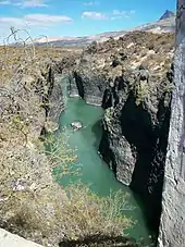 Aguas arriba del pueblo de Bardas Blancas, el río pasa por una estrecha garganta entre rocas volcánicas.