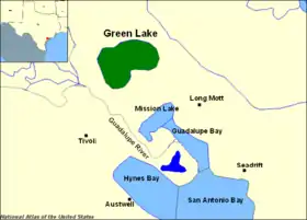 El río San Antonio (386 km) también desemboca en el río Guadalupe al norte de Tivoli (479 hab.). Por delante de la entrada en el estuario de la bahía de San Antonio, el río forma un delta y se divide en dos distributarios, llamados respectivamente Guadalupe Norte y Guadalupe Sur. Cada distributario fluye al estuario de la bahía de San Antonio en la bahía de Guadalupe.[4][5]