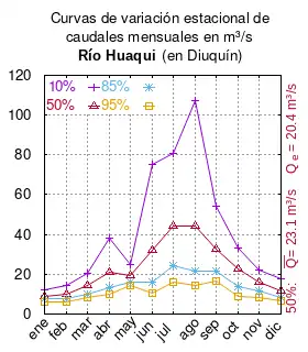 Los datos del diagrama superior fueron recogidos de la publicación de la DGA "Evaluación de los recursos hídricos superficiales de la cuenca del río Bio Bio." En su anexo 4 se incluyen los datos para las curvas de variación estacional del río Huaqui en Diuquín.[2]: 13 [notas 1]