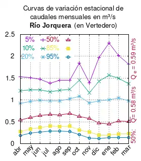 El caudal del río (en un lugar fijo) varía en el tiempo, por lo que existen varias formas de representarlo. Una de ellas son las curvas de variación estacional que, tras largos periodos de mediciones, predicen estadísticamente el caudal mínimo que lleva el río con una probabilidad dada, llamada probabilidad de excedencia. La curva de color rojo ocre (con ) muestra los caudales mensuales con probabilidad de excedencia de un 50%. Esto quiere decir que ese mes se han medido igual cantidad de caudales mayores que caudales menores a esa cantidad. Eso es la mediana (estadística), que se denota Qe, de la serie de caudales de ese mes. La media (estadística) es el promedio matemático de los caudales de ese mes y se denota .