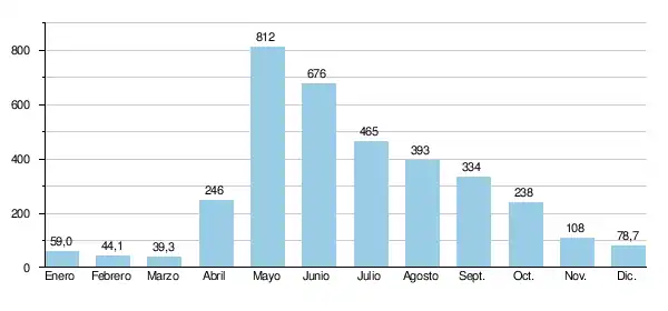 EL caudal medio mensual observado en marzo (mínimo de estiaje) es de 39.3 m³/s, lo que supone menmos del 5% del caudal emdio del mes de mayo, que es de 812 m³/s, lo que testimonia la amplitud importante de las variaciones estacionales, y la violencia de las crecidas de mayo. En el periodo de observación de 49 años, el caudal menusal mínimo ha sido de 23.7 m³/s (marzo de 1969), mientras que el caudal mensual máximo se elevaba a 1.780 m³/s en junio de 1966. UN caydal mensual inferior a los 20 m³/s es rarísimo en este río.