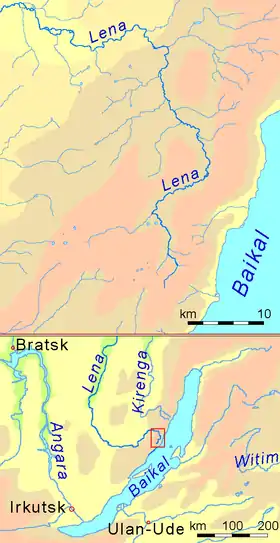 El río Kírenga nace de la confluencia de dos ramales, el Právaya Kírenga (Kírenga derecha) y Lévaya Kírenga (Kírenga izquierda), que nacen en la vertiente oeste de los montes Baikal. El río discurre en dirección norte y desagua por la derecha en el río Lena, en la localidad de Kírensk (12.800 hab. en 2007). Sus principales afluentes son los ríos Ulkán y Minya, por la derecha, y el río Janda, por la izquierda.