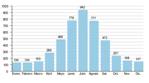 El caudal medio mensual observado en febrero (mínimo de estiaje) alcanza los 134 m³/s, o sea siete vez menos que el caudal medio del mes de julio (942 m³/s), lo que atestigua una amplitud media de variación estacional.