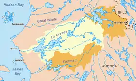 El río ha sido ampliamente desarrollado como una fuente de energía hidroeléctrica por Hydro-Québec, a partir del año 1974. Una superficie de 9.900 kilómetros cuadrados fue inundada y casi todo el caudal del río Eastmain fue desviado a la cuenca de La Grande. En el río La Grande y sus afluentes se han construido las siguientes centrales generadoras, en orden aguas arriba: