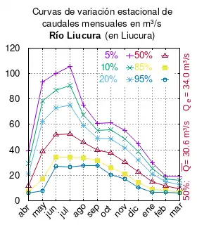 El caudal del río (en un lugar fijo) varía en el tiempo, por lo que existen varias formas de representarlo. Una de ellas son las curvas de variación estacional que, tras largos periodos de mediciones, predicen estadísticamente el caudal mínimo que lleva el río con una probabilidad dada, llamada probabilidad de excedencia. La curva de color rojo ocre (con ) muestra los caudales mensuales con probabilidad de excedencia de un 50%. Esto quiere decir que ese mes se han medido igual cantidad de caudales mayores que caudales menores a esa cantidad. Eso es la mediana (estadística), que se denota Qe, de la serie de caudales de ese mes. La media (estadística) es el promedio matemático de los caudales de ese mes y se denota .