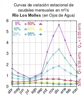 El caudal del río (en un lugar fijo) varía en el tiempo, por lo que existen varias formas de representarlo. Una de ellas son las curvas de variación estacional que, tras largos periodos de mediciones, predicen estadísticamente el caudal mínimo que lleva el río con una probabilidad dada, llamada probabilidad de excedencia. La curva de color rojo ocre (con ) muestra los caudales mensuales con probabilidad de excedencia de un 50%. Esto quiere decir que ese mes se han medido igual cantidad de caudales mayores que caudales menores a esa cantidad. Eso es la mediana (estadística), que se denota Qe, de la serie de caudales de ese mes. La media (estadística) es el promedio matemático de los caudales de ese mes y se denota .