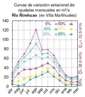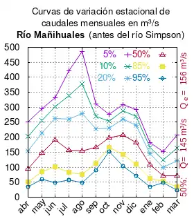 El caudal del río (en un lugar fijo) varía en el tiempo, por lo que existen varias formas de representarlo. Una de ellas son las curvas de variación estacional que, tras largos periodos de mediciones, predicen estadísticamente el caudal mínimo que lleva el río con una probabilidad dada, llamada probabilidad de excedencia. La curva de color rojo ocre (con ) muestra los caudales mensuales con probabilidad de excedencia de un 50%. Esto quiere decir que ese mes se han medido igual cantidad de caudales mayores que caudales menores a esa cantidad. Eso es la mediana (estadística), que se denota Qe, de la serie de caudales de ese mes. La media (estadística) es el promedio matemático de los caudales de ese mes y se denota .