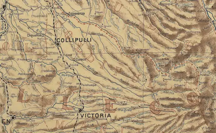 - Malleco (Río).-—En la provincia á que presta su nombre. Nace de una pequeña laguna de la base de los Andes é inmediata hacia el O. del volcán de Lonquimay, y corre en su primeras parte por entre serranías y bosques de esa cordillera en dirección al O., y luego hacia el NO. por terrenos más bajos hasta su confluencia con el río que pasa por la ciudad de Angol, lo que verifica á cuatro kilómetros al N. de ella, al cabo de unos 75 de curso ligeramente pando; formando esa reunión el río Vergara. Es de caudal poco abundante y lecho profundo. Junto á Collipulli lo atraviesa un monumental viaducto de ferrocarril de 350 metros de largo y 98 de alto sobre la línea sinclinal, construido por el injeniero V. A. Lastarria é inaugurado por el Presidente Balmaceda el 26 de octubre de 1890. Sus riberas, fértiles y amenas, antes ocupadas por indios bravíos, contíenen al presente: en el lado norte las poblaciones de Collipulli, Curaco, Mariluán, Perasco, y en el del sur á Chiguaihue, Cancura, Lolenco, &c. También existió en su margen sur cerca de su término la primitiva ciudad de Angol. El nombre significa agua de arcilla blanquizca, formado de malle, esa especie de tierra, y de co, agua.