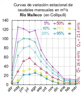 El caudal del río (en un lugar fijo) varía en el tiempo, por lo que existen varias formas de representarlo. Una de ellas son las curvas de variación estacional que, tras largos periodos de mediciones, predicen estadísticamente el caudal mínimo que lleva el río con una probabilidad dada, llamada probabilidad de excedencia. La curva de color rojo ocre (con ) muestra los caudales mensuales con probabilidad de excedencia de un 50%. Esto quiere decir que ese mes se han medido igual cantidad de caudales mayores que caudales menores a esa cantidad. Eso es la mediana (estadística), que se denota Qe, de la serie de caudales de ese mes. La media (estadística) es el promedio matemático de los caudales de ese mes y se denota .