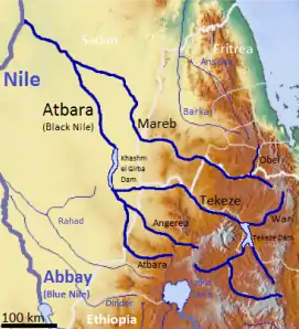 Según el Resumen Estadístico de Etiopía de 1967/68, el río Mereb tiene una longitud de 440 km. El Ministerio de Recursos Hídricos de Etiopía informa de que su cuenca hidrográfica es de 5700 km², con una escorrentía anual de 260 hm³.[2] Otras fuentes hablan de una cuenca de entre 21 000 y 44 000 km² en total, y de una descarga de 21,6 m³/sde media a lo largo del año, y de 870 m³/s en los picos.[3] Su cabecera nace al suroeste de Asmara, en el centro de Eritrea. Fluye hacia el sur, limitando con Etiopía, y luego hacia el oeste a través de Eritrea occidental para llegar a las llanuras sudanesas cerca de Kassala. A diferencia de los ríos Setit o Takazze, que salen de Etiopía y también forman una frontera natural con Eritrea, las aguas del Mareb no suelen llegar al Nilo,[4] sino que se disipan en las arenas de las llanuras orientales sudanesas.