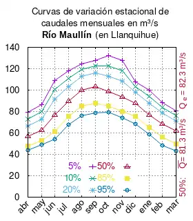 El caudal del río (en un lugar fijo) varía en el tiempo, por lo que existen varias formas de representarlo. Una de ellas son las curvas de variación estacional que, tras largos periodos de mediciones, predicen estadísticamente el caudal mínimo que lleva el río con una probabilidad dada, llamada probabilidad de excedencia. La curva de color rojo ocre (con ) muestra los caudales mensuales con probabilidad de excedencia de un 50%. Esto quiere decir que ese mes se han medido igual cantidad de caudales mayores que caudales menores a esa cantidad. Eso es la mediana (estadística), que se denota Qe, de la serie de caudales de ese mes. La media (estadística) es el promedio matemático de los caudales de ese mes y se denota .