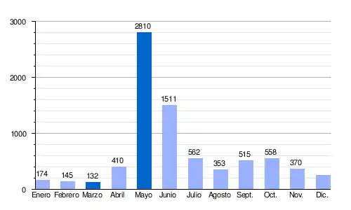 Las grandes crecidas se desarrollan en mayo (media mensual de 2810 m³/s) y junio. Desde la segunda mitad del mes de junio, el caudal del río baja fuertemente hasta un primer estiaje, en verano en el mes de agosto (353 m³/s). En septiembre el caudal remonta de nuevo bajo el efecto de las precipitaciones otoñales que conlleva una pequeña cima en el gráfico en octubre. A continuación se desarrolla el largo estiaje de invierno que tiene lugar de diciembre a marzo incluido. El caudal medio mensual observado en marzo (mínimo de estiaje), atiende a 132 m³/s, lo que significa 21 veces menos que el caudal del mes de mayo y que muestra la amplitud de las variaciones estacionales. En los 29 años del período de observación, el caudal mensual inferior ha sido 102 m³/s (mínimo apreciable) mientras que el máximo ha sido de 3970 m³/s.