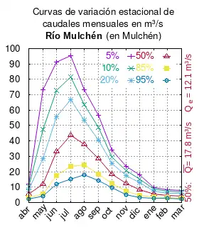 El caudal del río (en un lugar fijo) varía en el tiempo, por lo que existen varias formas de representarlo. Una de ellas son las curvas de variación estacional que, tras largos periodos de mediciones, predicen estadísticamente el caudal mínimo que lleva el río con una probabilidad dada, llamada probabilidad de excedencia. La curva de color rojo ocre (con ) muestra los caudales mensuales con probabilidad de excedencia de un 50%. Esto quiere decir que ese mes se han medido igual cantidad de caudales mayores que caudales menores a esa cantidad. Eso es la mediana (estadística), que se denota Qe, de la serie de caudales de ese mes. La media (estadística) es el promedio matemático de los caudales de ese mes y se denota .