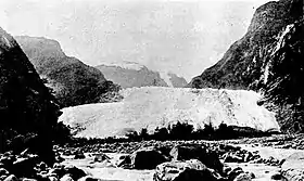 ![]() Ventisquero del río Nevado. Esta foto fue, posiblemente, la citada por Risopatrón en su descripción y que fue tomada por la expedición de Paul Krüger. | ||