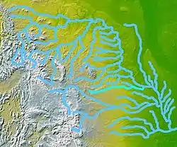 ![]() El Niobrara en la confluencia con el Misuri. El Niobrara corre desde abajo hacia arriba a la izqda., bajo el puente; el Misuri al fondo, fluyendo de izqda. a dcha. | ||