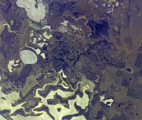 ![]() Boca del Nura River vista desde la Estación Espacial Internacional (El Nura va de arriba a la derecha a abajo a la izquierda). | ||