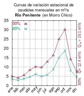 El caudal del río (en un lugar fijo) varía en el tiempo, por lo que existen varias formas de representarlo. Una de ellas son las curvas de variación estacional que, tras largos periodos de mediciones, predicen estadísticamente el caudal mínimo que lleva el río con una probabilidad dada, llamada probabilidad de excedencia. La curva de color rojo ocre (con ) muestra los caudales mensuales con probabilidad de excedencia de un 50%. Esto quiere decir que ese mes se han medido igual cantidad de caudales mayores que caudales menores a esa cantidad. Eso es la mediana (estadística), que se denota Qe, de la serie de caudales de ese mes. La media (estadística) es el promedio matemático de los caudales de ese mes y se denota .