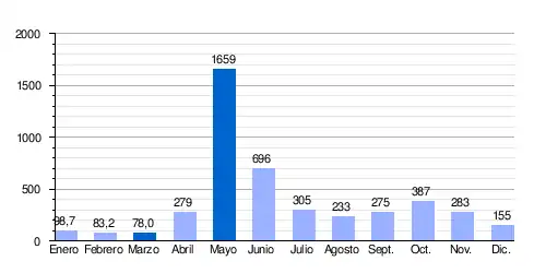 El caudal medio mensual observado en marzo (mínimo de estiaje) es de 78,0 m³/s, o menos del 5% del caudal promedio en el mes de mayo (1.659 m³/s), lo que pone de relieve la significativa amplitud de las variaciones estacionales. Estas diferencias también pueden ser aún más altas: así, en el período de observación de 86 años, el caudal mínimo mensual fue de 42,4 m³/s (enero 1915), mientras que el flujo mensual máximo fue de 2.910 m³/s en mayo de 1955.