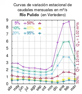 El caudal del río (en un lugar fijo) varía en el tiempo, por lo que existen varias formas de representarlo. Una de ellas son las curvas de variación estacional que, tras largos periodos de mediciones, predicen estadísticamente el caudal mínimo que lleva el río con una probabilidad dada, llamada probabilidad de excedencia. La curva de color rojo ocre (con ) muestra los caudales mensuales con probabilidad de excedencia de un 50%. Esto quiere decir que ese mes se han medido igual cantidad de caudales mayores que caudales menores a esa cantidad. Eso es la mediana (estadística), que se denota Qe, de la serie de caudales de ese mes. La media (estadística) es el promedio matemático de los caudales de ese mes y se denota .