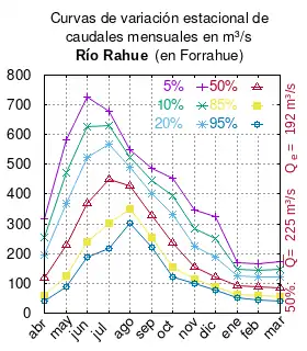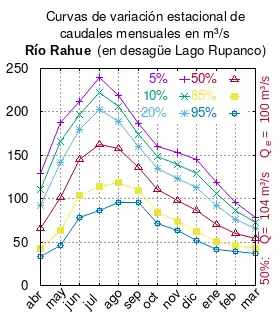 El caudal del río (en un lugar fijo) varía en el tiempo, por lo que existen varias formas de representarlo. Una de ellas son las curvas de variación estacional que, tras largos periodos de mediciones, predicen estadísticamente el caudal mínimo que lleva el río con una probabilidad dada, llamada probabilidad de excedencia. La curva de color rojo ocre (con ) muestra los caudales mensuales con probabilidad de excedencia de un 50%. Esto quiere decir que ese mes se han medido igual cantidad de caudales mayores que caudales menores a esa cantidad. Eso es la mediana (estadística), que se denota Qe, de la serie de caudales de ese mes. La media (estadística) es el promedio matemático de los caudales de ese mes y se denota .
