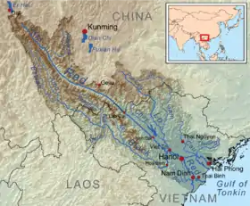 El río Rojo comienza en la provincia china de Yunnan, en las montañas al sur de la ciudad de Dali. Fluye generalmente hacia el sureste, pasando por zonas de minorías étnicas de Dai antes de salir de China a través de la Prefectura Autónoma Honghe Hani y Yi. Entra en Vietnam por la provincia de Lao Cai. Forma parte de la frontera internacional entre China y Vietnam. Al llegar a las tierras bajas cerca de Viet Tri, el río y sus distributarios forman el delta del río Rojo. El río Rojo pasa por la capital de Vietnam, Hanói, antes de desembocar en el golfo de Tonkin. Tonkin es el antiguo nombre de las provincias del norte de Vietnam y, por tanto, el epónimo cuerpo de agua que recibe el río principal de "Tonkin".