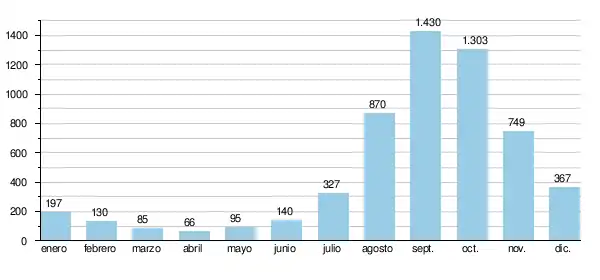 Caudal medio mensual del río Sara (Bahr Sara) medido en la estación hidrológica de Moïssala (en m³/s)