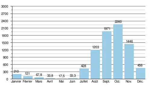 (en m³/s, para una cuenca vertiente de 268000 km². Datos calculados para el período 1903-74)[22]