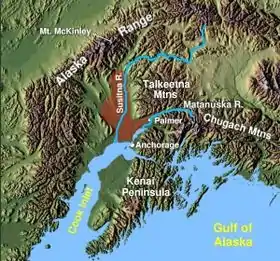 El Susitna, junto con el río Matanuska, drenan el amplio valle Matanuska-Susitna al sur de la cordillera de Alaska.[3] Su cuenca hidrográfica se extiende a lo largo de 52.000 kilómetros cuadrados.[2]