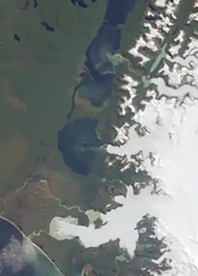 ![]() Desde el norte (arriba) llega el canal Moraleda que termina en el fiordo Elefantes. A su extremo oeste llega desde el sur el río Témpanos, que aparece con una no tan delgada línea que sale desde la laguna San Rafael. Ver imagen completa en Foto satelital. | ||