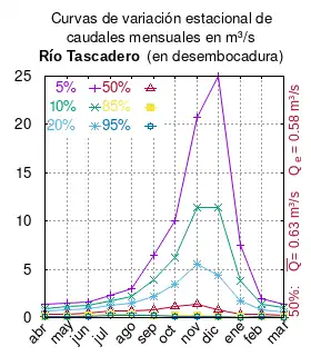 El caudal del río (en un lugar fijo) varía en el tiempo, por lo que existen varias formas de representarlo. Una de ellas son las curvas de variación estacional que, tras largos periodos de mediciones, predicen estadísticamente el caudal mínimo que lleva el río con una probabilidad dada, llamada probabilidad de excedencia. La curva de color rojo ocre (con ) muestra los caudales mensuales con probabilidad de excedencia de un 50%. Esto quiere decir que ese mes se han medido igual cantidad de caudales mayores que caudales menores a esa cantidad. Eso es la mediana (estadística), que se denota Qe, de la serie de caudales de ese mes. La media (estadística) es el promedio matemático de los caudales de ese mes y se denota .